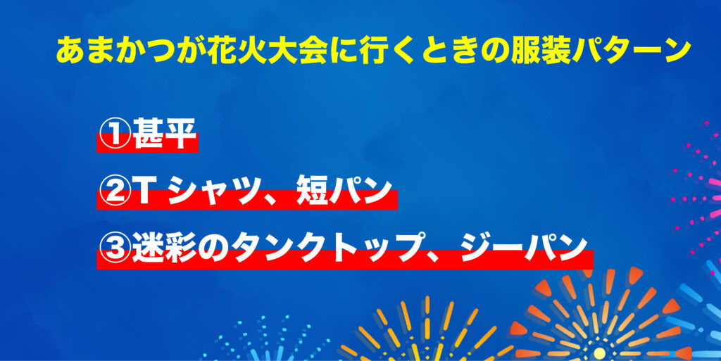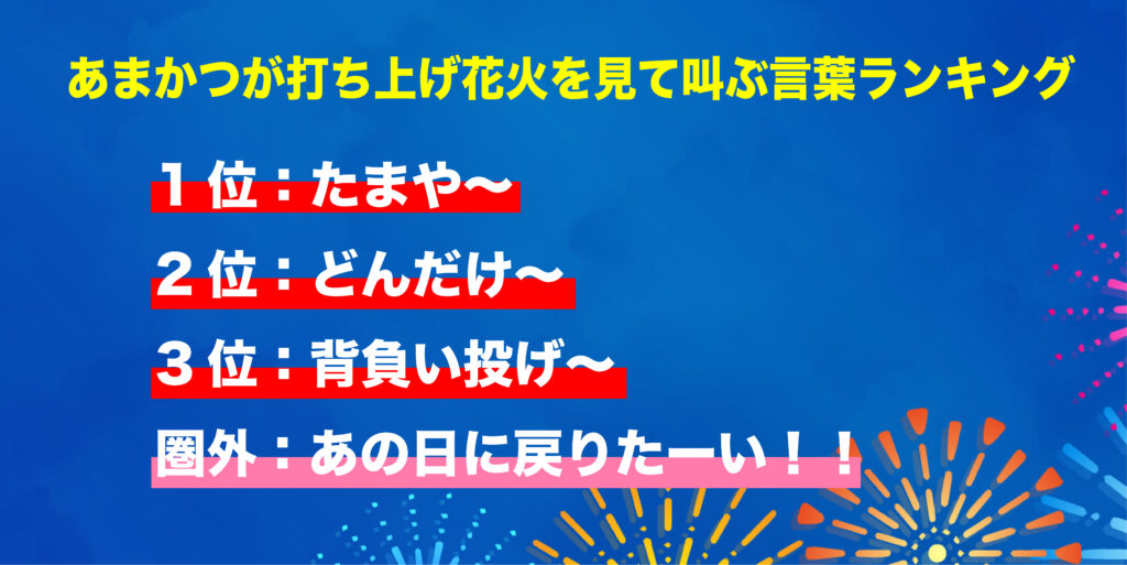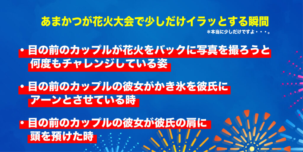 全く役に立たない情報ですが、もしよかったら、参考にして花火大会を楽しんでくださいね。