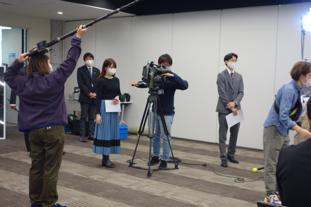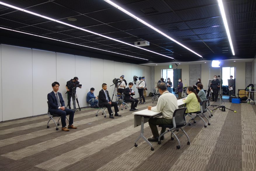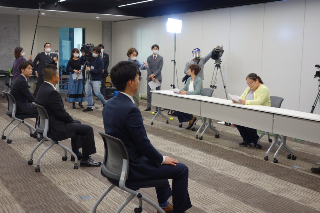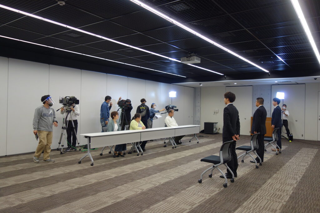 たくさんのカメラに囲まれた中で、保護者のみなさんの鋭い質問に答える・・・