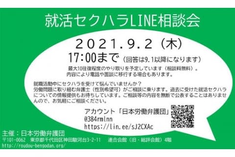 ニュース 「就活セクハラ」LINEで無料相談実施中、9月2日まで受付 日本労働弁護団