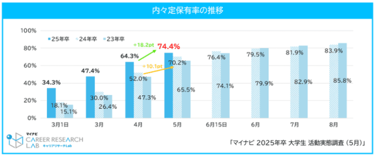 ニュース 25年卒学生の5月時点での内々定率は74.4%、4割近くが就活で生成AIを利用【…