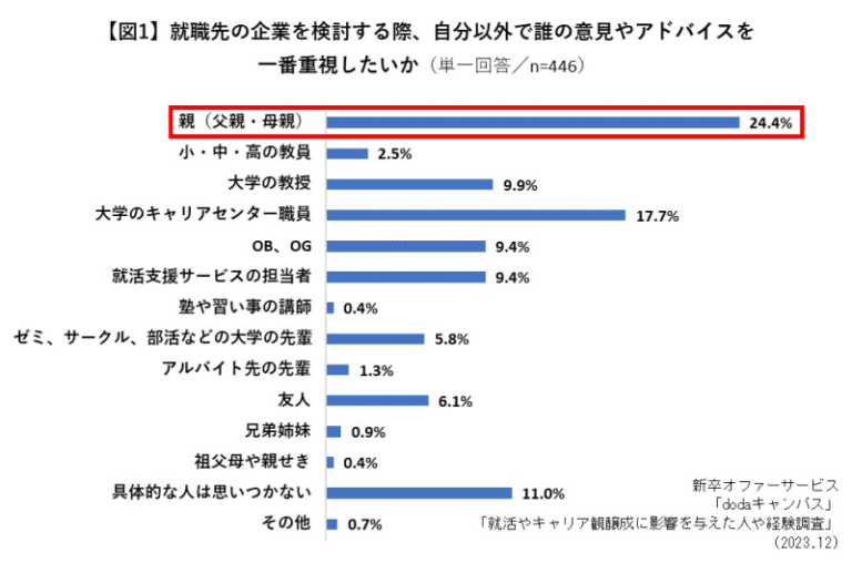 ニュース 大学2~3年生の24.4%、就職先の選択でもっとも意見を重視するのは「親(父親・…