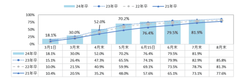 ニュース 【2024年卒就活生】もう終盤、8月1日で内定率87%、進路確定率77%!今年は…