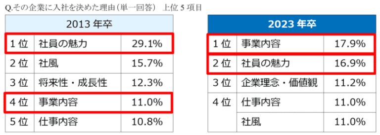 ニュース 大学生の就活、入社先を決めた理由は過去10年で「社員の魅力」が半減し「事業内容」…